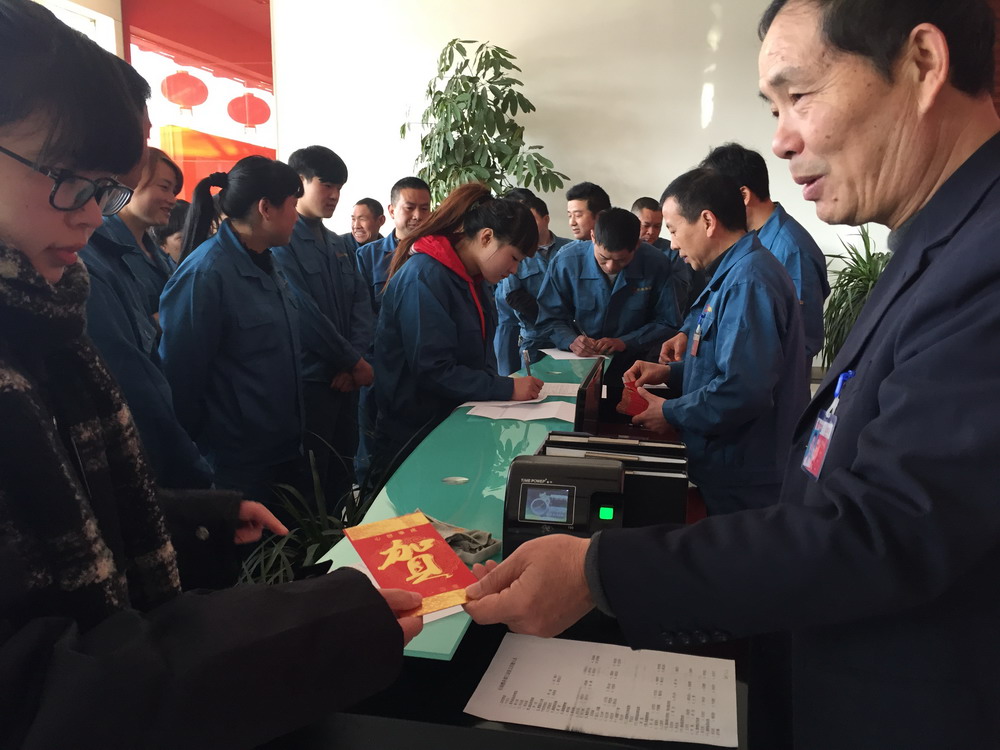 集团常务副总经理管立勇、集团黄书记、集团副总经理兼台州市纸箱厂常务副厂长苏志勇在公司行政楼大厅给每位准时到岗的员工送上了开工利。据统计,今年公司的老员工到岗率超过95%,个别年前办理了离职手续的一线员工也按时到岗,在深思熟虑后选择回到汇宝继续为自己的人生拼搏。