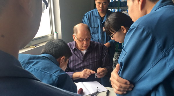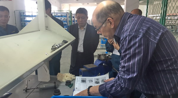 费岑斯总监在集团常务副总裁管立勇、集团独立董事、总顾问张恒亮、集团副总裁罗一明、缝纫机股份公司副总经理兼开发部部长陈主锐等的陪同下考察了汇宝与上工合作项目之一的厚料机生产中心,检查了零配件的参数情况,并在装配线上对技术工人做了全面的指导。费岑斯总监还用德国杜克普的相关标准对汇宝生产的“DA”品牌厚料机整机做了细致的检测,提出了一些专业性的改进意见。